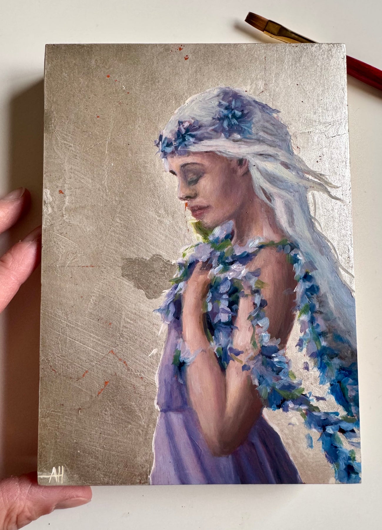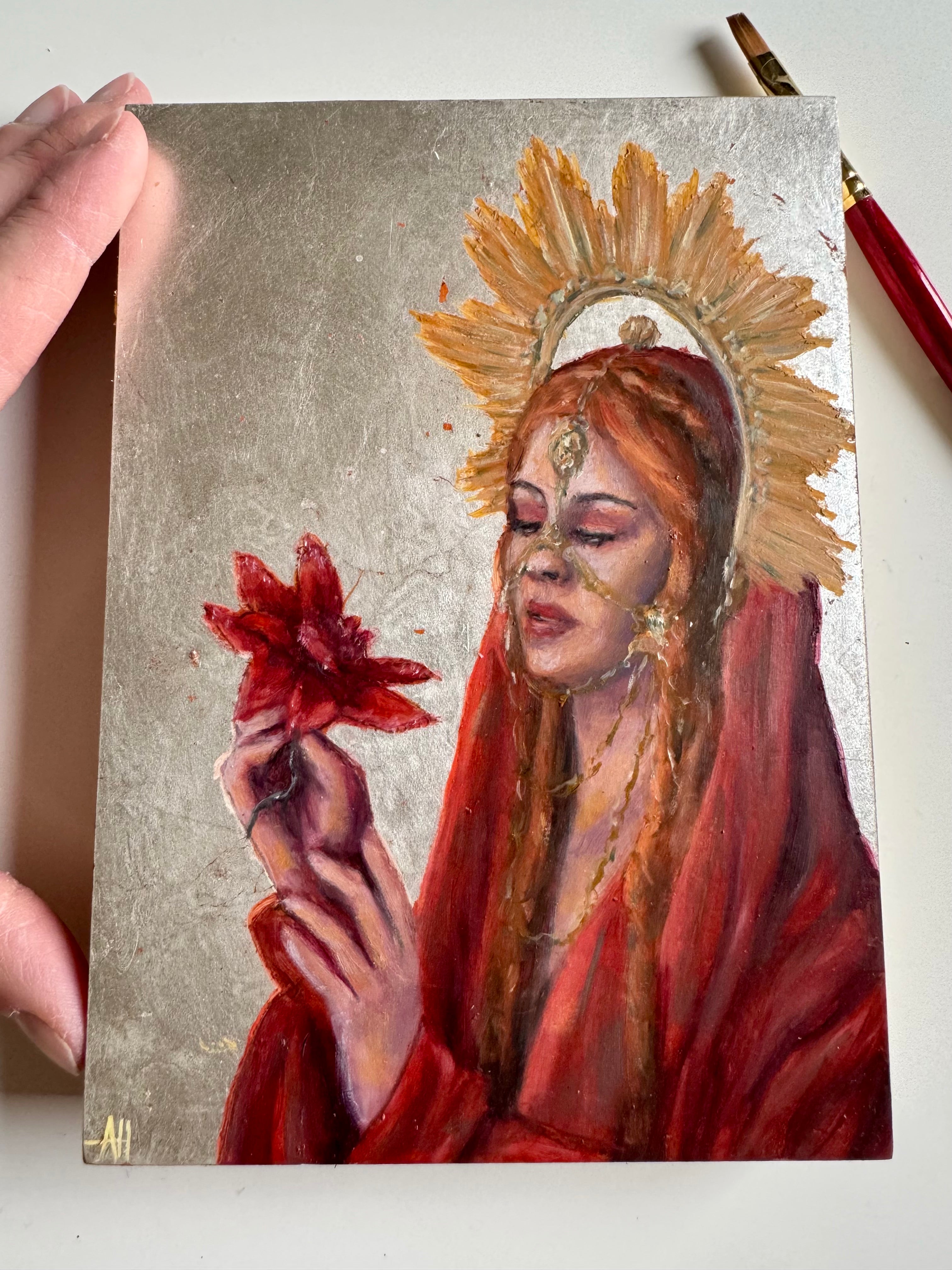 5x7 inches oil and silver leaf on canvas, varnished and ready to hang. Free shipping in the USA.
