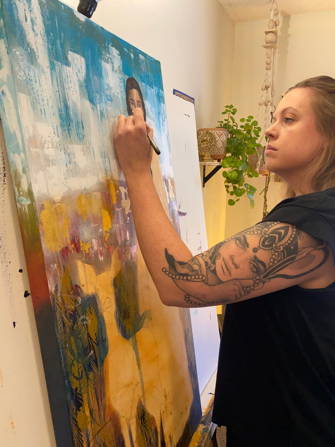 Through 20 years of meditation and personal work, I’ve deepened my connexion to the magic of this power and set out to capture it on canvas. I paint and share my vision through deities, symbols and other depictions of the spiritual and Divine Feminine. Blending gilding, mixed media and oil painting, I aim to uncover ancient wisdom and add to its voice.